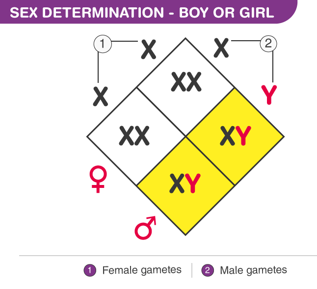The male’s Y chromosome combines with the female’s X chromosome, the mother gives birth to a boy